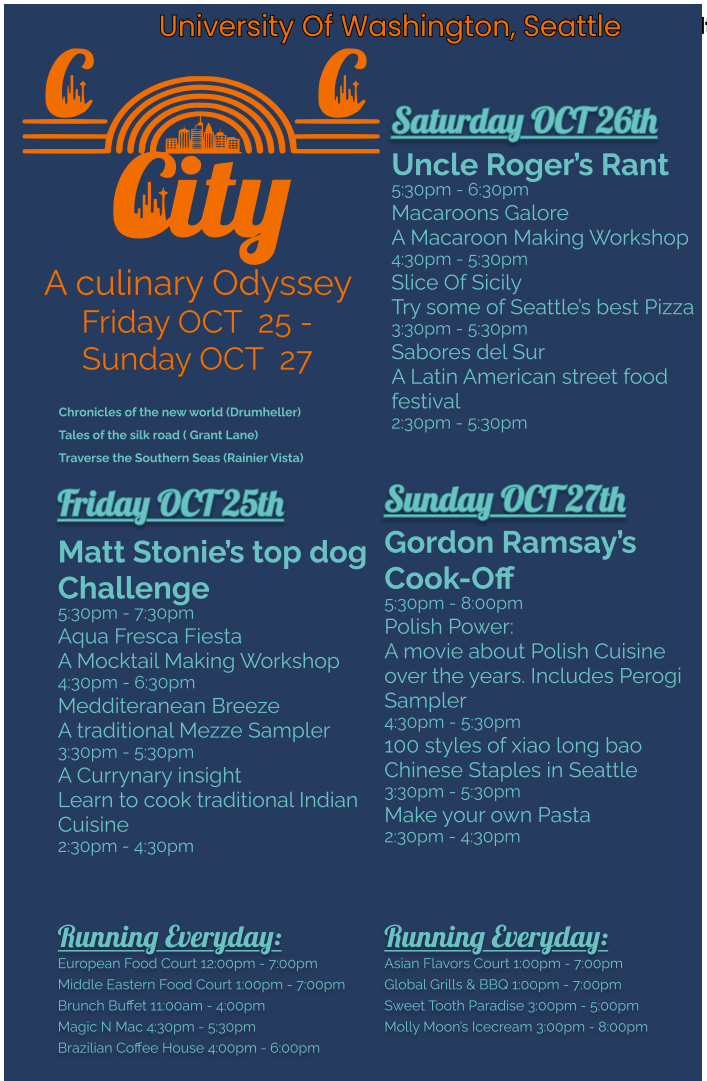 How can we make Seattle’s diverse culinary culture more visible and accessible to students on campus? Seattle offers incredible food from around the world but most students stick to what’s familiar, limited by cost, time, or simply not knowing what’s out there. CITY is a design concept for a student-centered food festival that makes global cuisines feel more accessible and exciting. The challenge was to prototype a festival ecosystem — including a visual identity, promotional materials, and an event-mapping tool that: